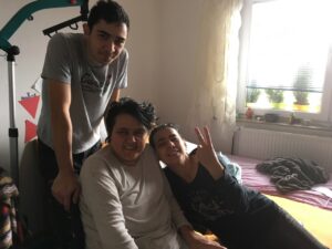 étaient trop hautes pour elle, ce qui fait que ses genoux étaient placés plus haut que ses hanches. Cette position crée une pression accrue isolée en un point de ses fesses, ce qui fait que les tissus commencent à se dégrader et à mourir avec le temps. De simples ajustements ont été apportés aux repose-pieds et les mains curatives d'Équipe Canada lui ont fourni un coussin réducteur de pression pour remplacer le coussin en mousse qu'elle utilisait. Elle a immédiatement remarqué une amélioration significative de la douleur et de sa capacité à s'asseoir confortablement. Avant notre départ de Sarajevo, nous avions entendu dire qu'elle était de nouveau dans la communauté et qu'elle fréquentait ses amis.